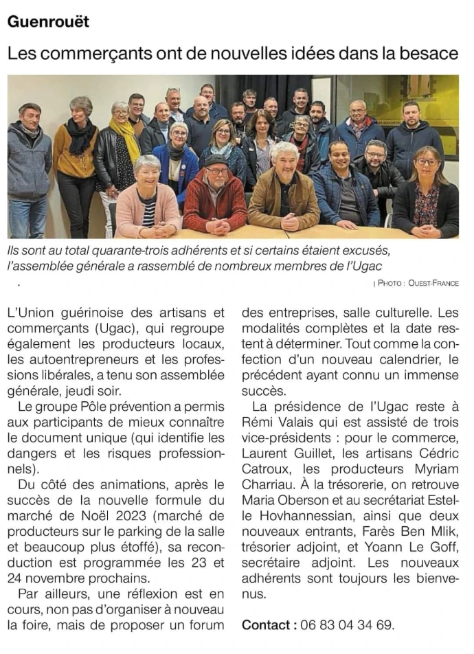 L’Union Guérinoise des Artisans et Commerçants (UGAC) est née en 1995, à l’initiative d’un petit groupe de bénévoles animés par une envie simple : faire vivre le commerce local et créer du lien sur la commune de Guenrouët.