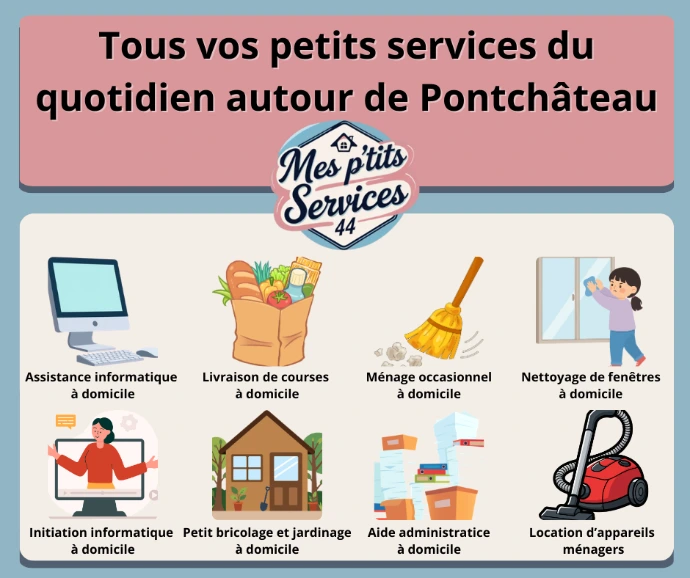 "Mes p’tits services 44 vous accompagne au quotidien avec des prestations à domicile : assistance informatique, aide administrative, ménage, courses, location d'appareils pratiques et bien plus encore.